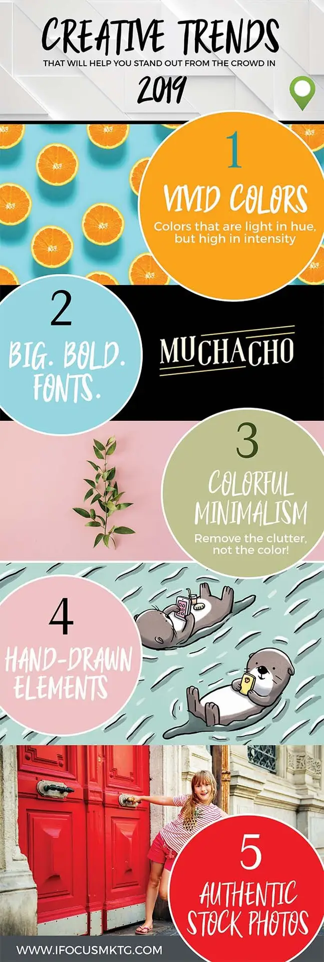 To recap, vivid colors, bold fonts colorful minimalism, hand-drawn elements, and authentic stock photos are among the most popular predicted design trends in the coming year, and 2019 is sure to bring even more unique new designs along the way. We’re excited to experiment with these trends and use them to help your business launch a successful marketing campaign!