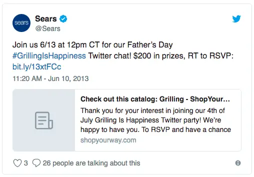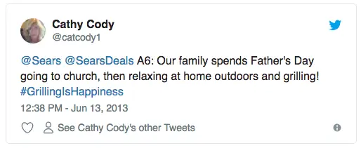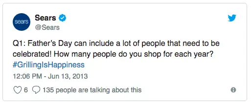 The general purpose of this campaign was to prompt followers to share their plans for Father’s Day, plus any grilling tips they had. Sears posed 10 different questions to consumers, encouraging them to answer back with live tweets, which made for a captivating, real-time marketing initiative.